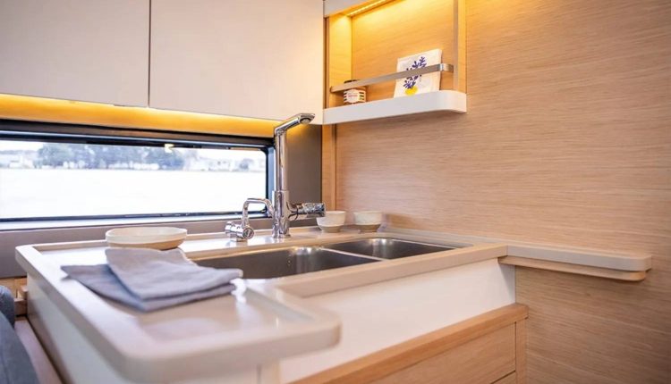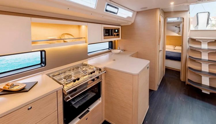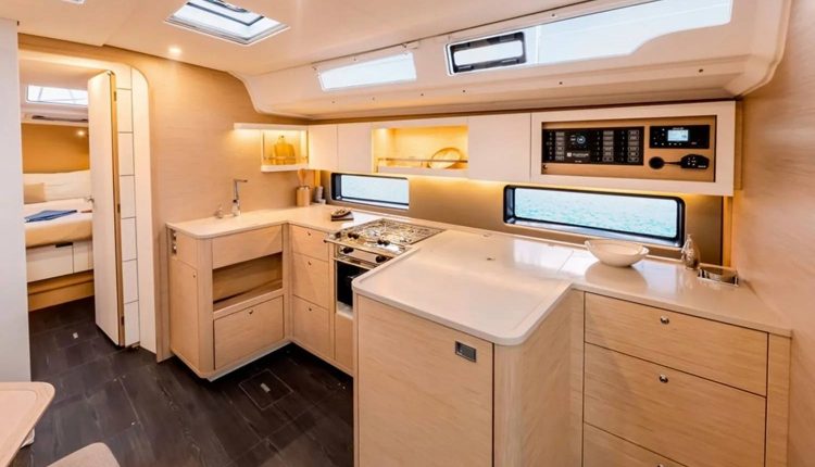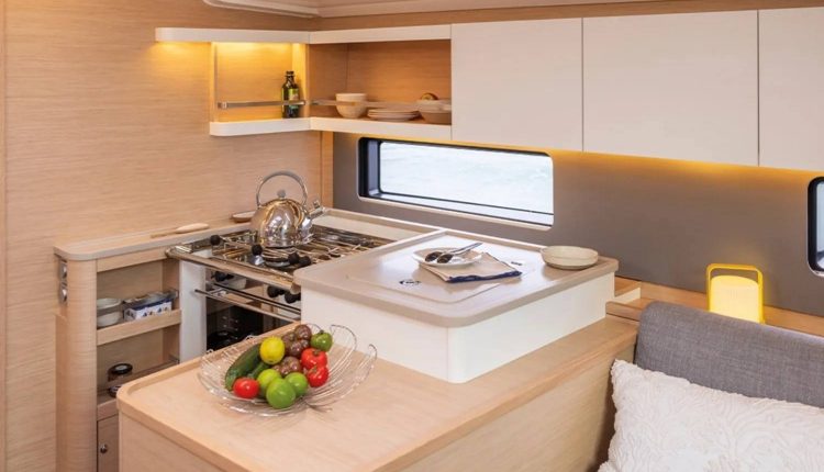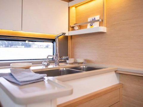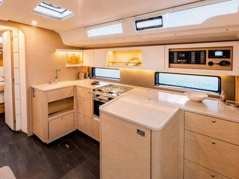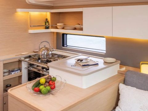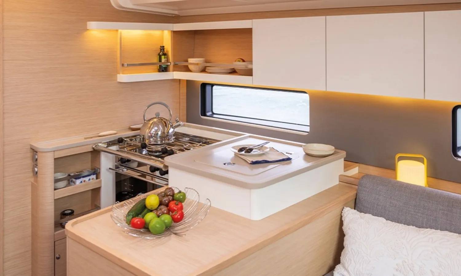 The fully equipped galley includes a refrigerator, oven, cooker, sink, and complete kitchenware, allowing guests to enjoy gourmet meals on board while surrounded by stunning ocean views.