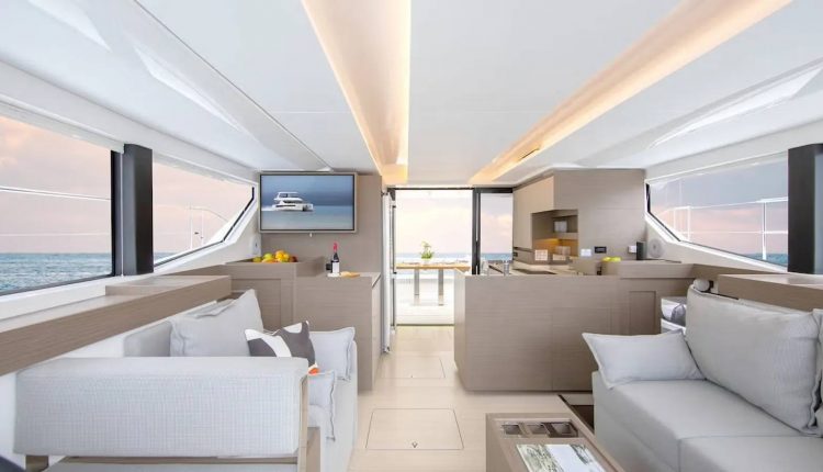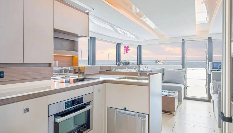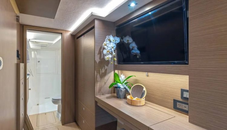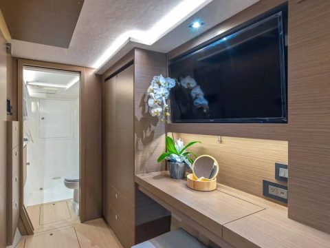 The interior is thoughtfully designed, featuring airy living spaces, a flat-screen TV, audio system, DVD player, and outside speakers for entertainment. The fully equipped galley comes with a microwave, refrigerator, oven, cooker, and sink, making onboard dining effortless and enjoyable.