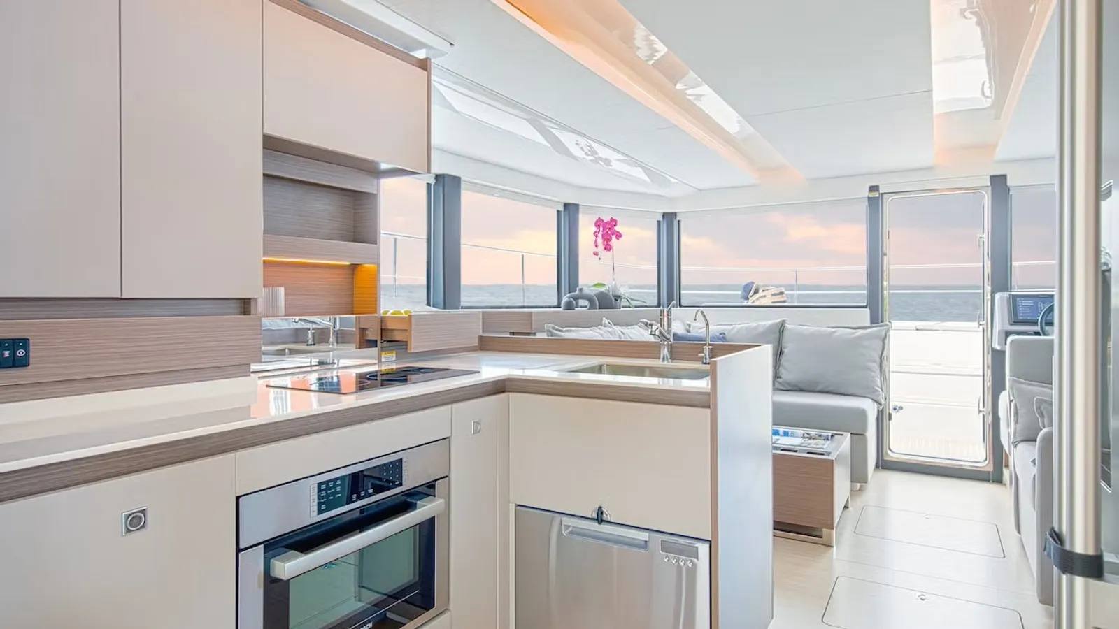 The interior is thoughtfully designed, featuring airy living spaces, a flat-screen TV, audio system, DVD player, and outside speakers for entertainment. The fully equipped galley comes with a microwave, refrigerator, oven, cooker, and sink, making onboard dining effortless and enjoyable.