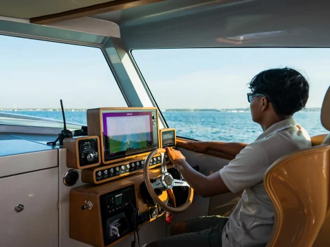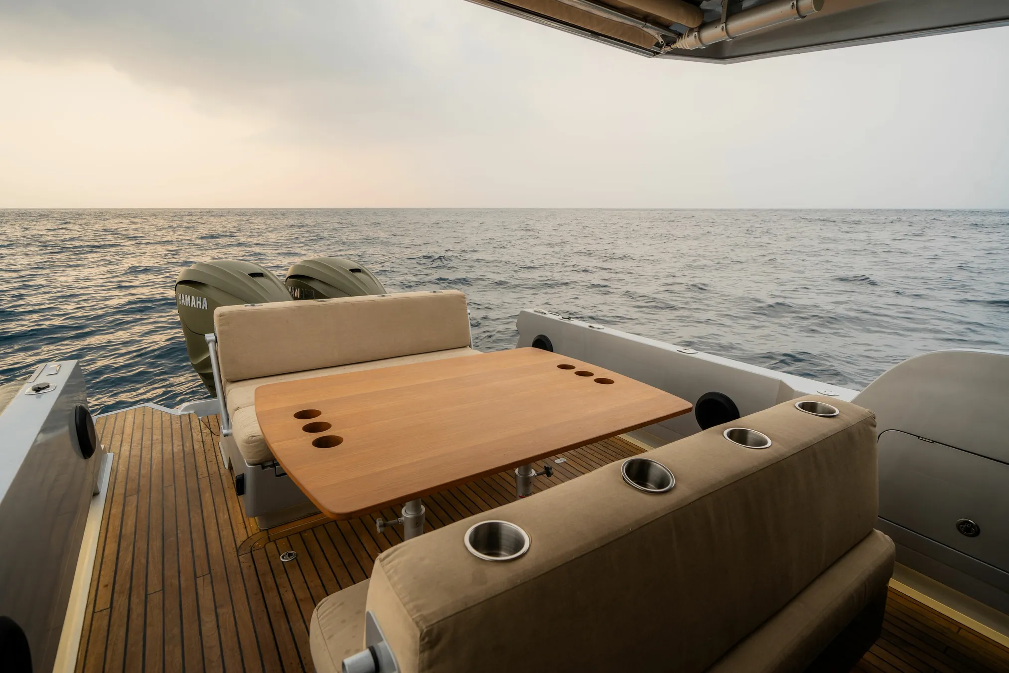 Powered by twin 425hp engines, Wedanta delivers speed and reliability, ensuring smooth navigation between destinations. Onboard features enhance comfort at sea, including a bimini for shade while anchored or docked, an outside shower for refreshing rinses after swimming, and a fridge to keep drinks and snacks chilled throughout your journey.