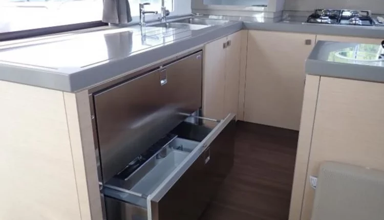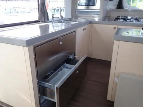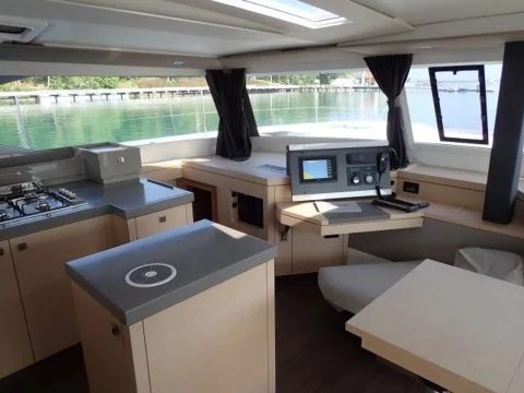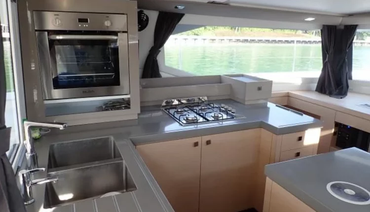 The galley is equipped to handle any culinary needs, featuring a microwave, fridge, freezer, oven, and cooker.