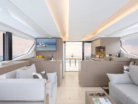 The interior is thoughtfully designed, featuring airy living spaces, a flat-screen TV, audio system, DVD player, and outside speakers for entertainment. The fully equipped galley comes with a microwave, refrigerator, oven, cooker, and sink, making onboard dining effortless and enjoyable.