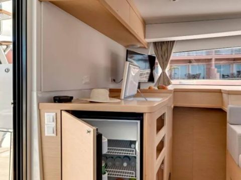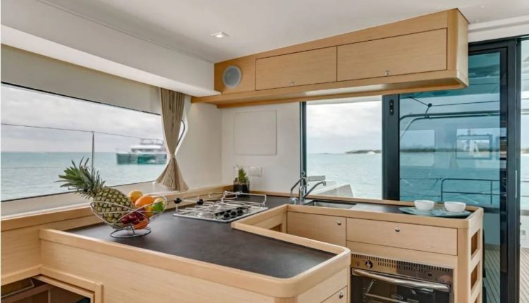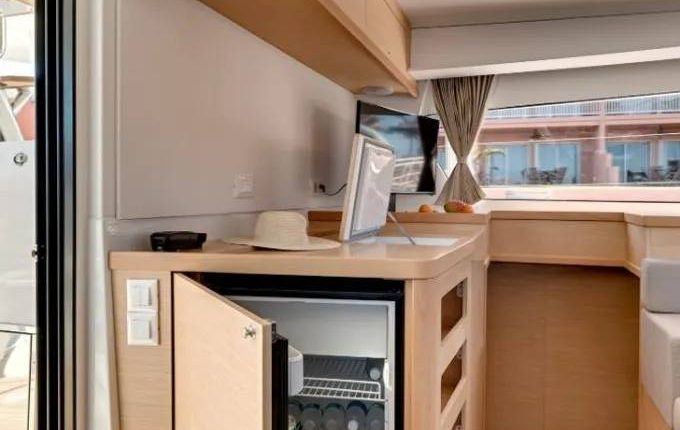 The galley is outfitted with everything you need, including a refrigerator, oven, stove, sink, and complete set of kitchenware—perfect for preparing meals at sea.