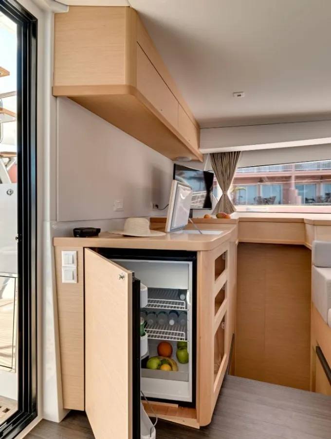 The galley is outfitted with everything you need, including a refrigerator, oven, stove, sink, and complete set of kitchenware—perfect for preparing meals at sea.